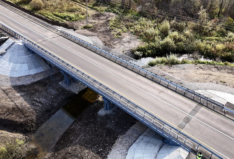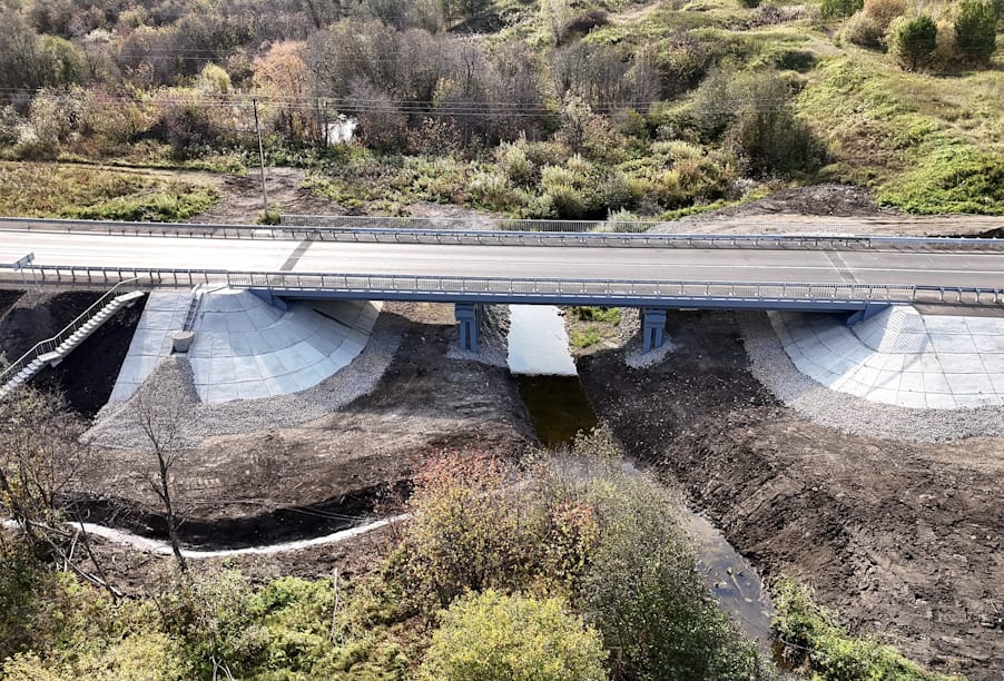 Работы на объекте выполнялись комплексно: специалисты выполнили сопряжение моста с насыпью, обустроили лестничный сход и водоотвод. Установили барьерное металлическое ограждение, перила и восемь дорожных знаков на сборных железобетонных фундаментах и металлических стойках. Проезжую часть дорожники разметили краской со световозвращающими микрошариками.